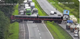 BR-324 tem trecho travado após carreta bitrem ficar atravessada na pista